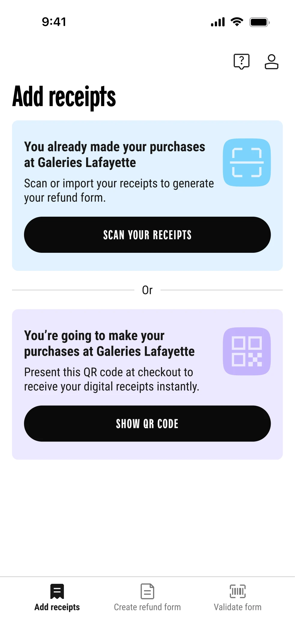 GoTaxFree est une application développée par les Galeries Lafayette pour simplifier les démarches de détaxe d'une clientèle internationale en magasin. J'en ai leadé la conception : création du service, naming, identité visuelle et expérience. L'enjeu : transformer un parcours administratif complexe en une expérience fluide, fiable et intégrée au parcours d'achat, en lien avec les équipes terrain du magasin Haussmann.
