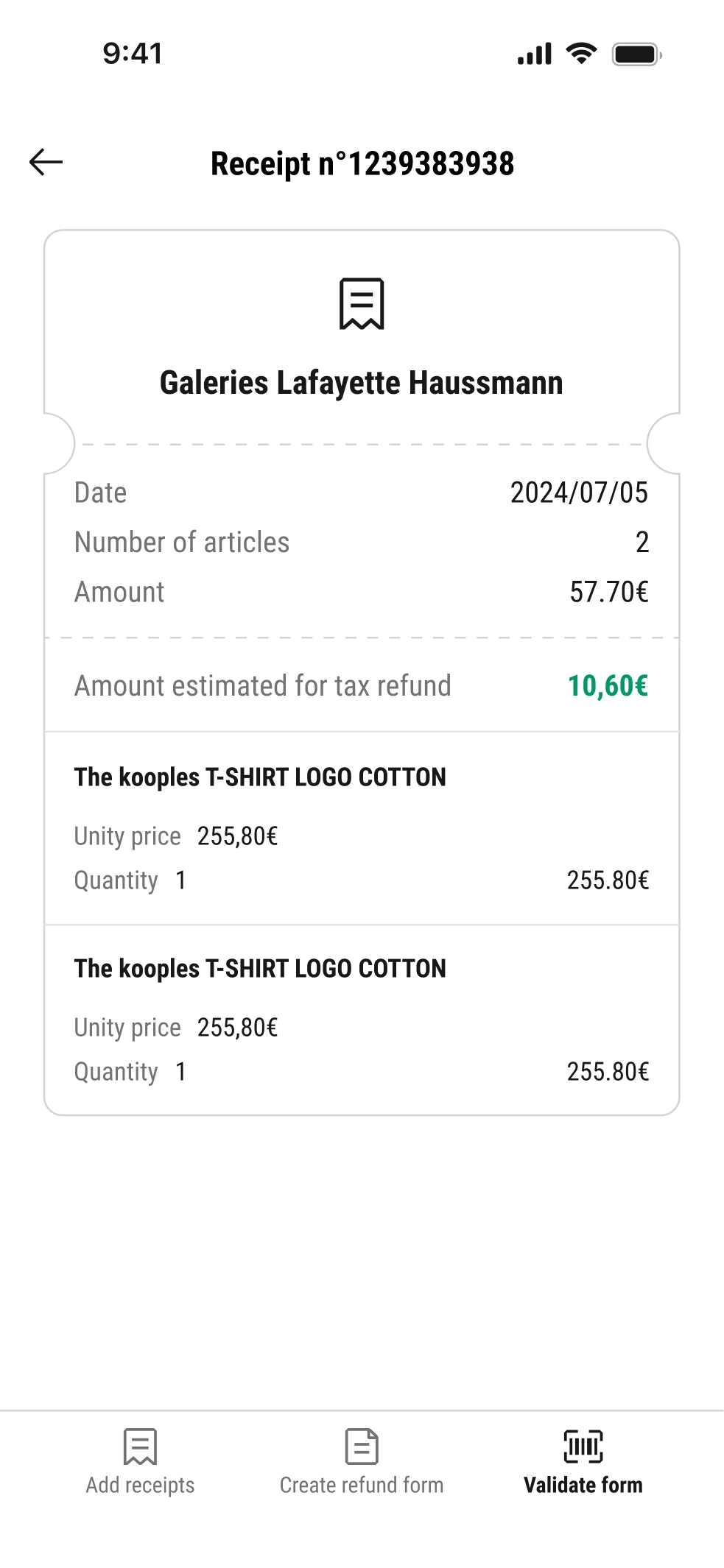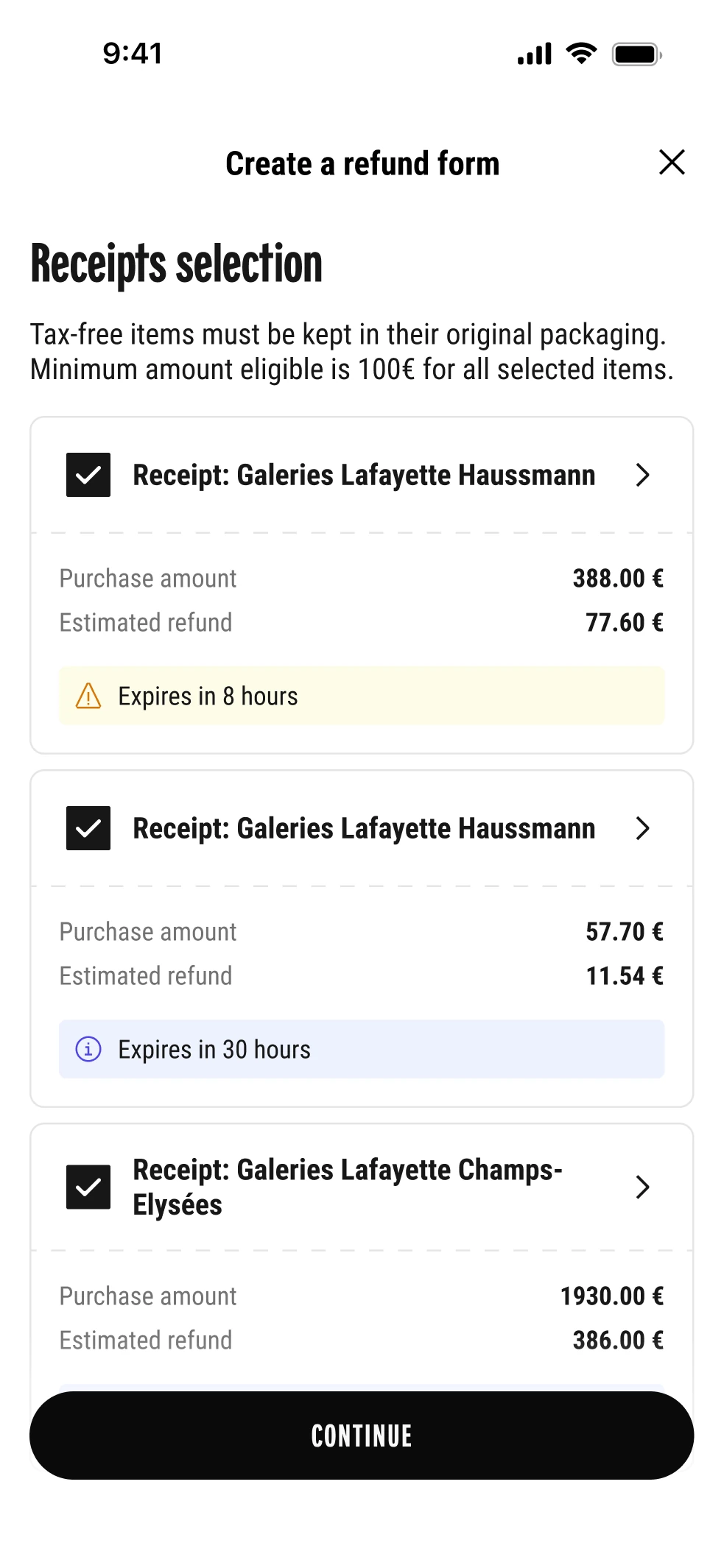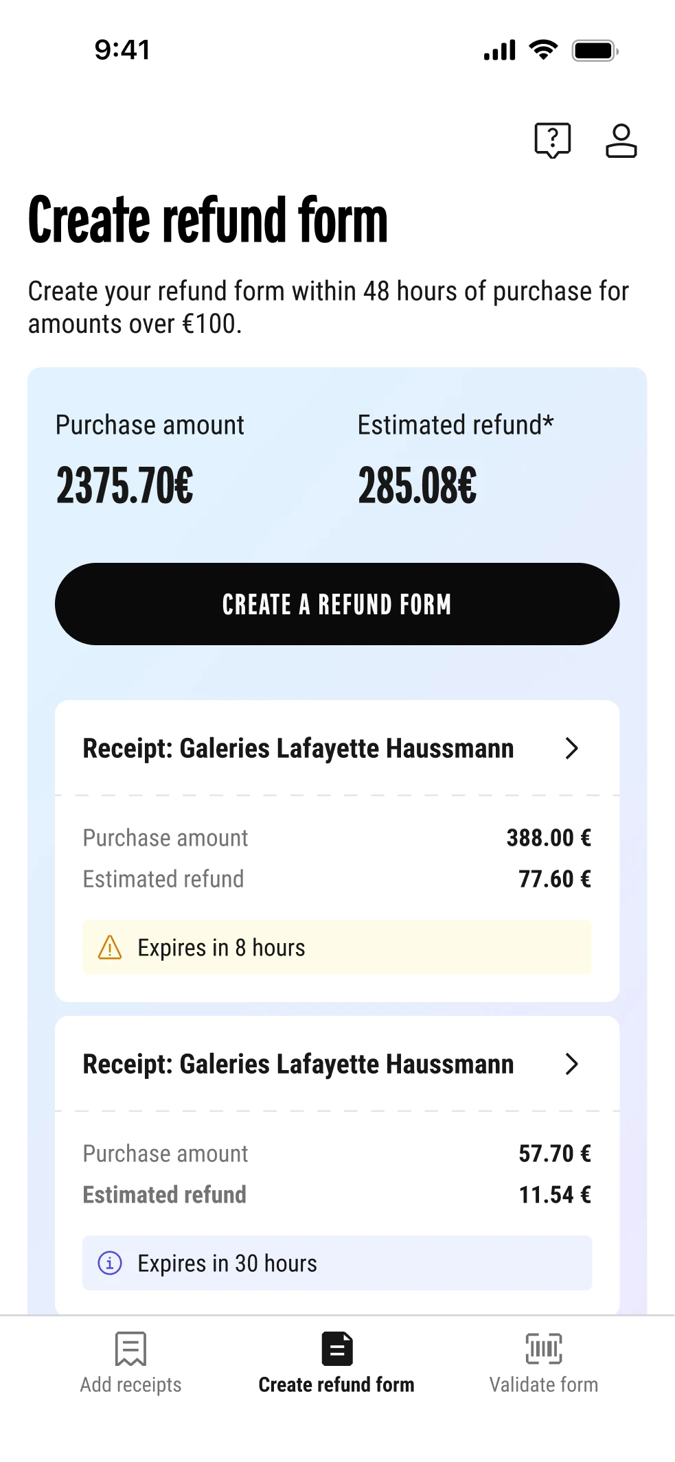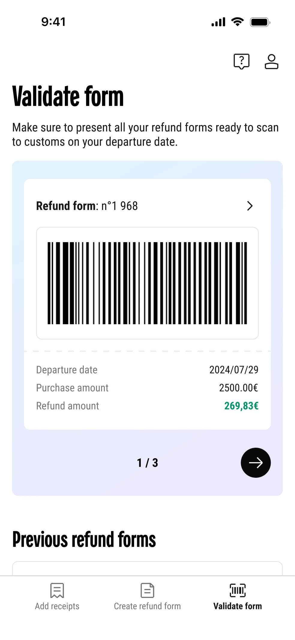 Objectif de l'app • Réduire les frictions et faciliter la demande de détaxe en un minimum d'étapes.